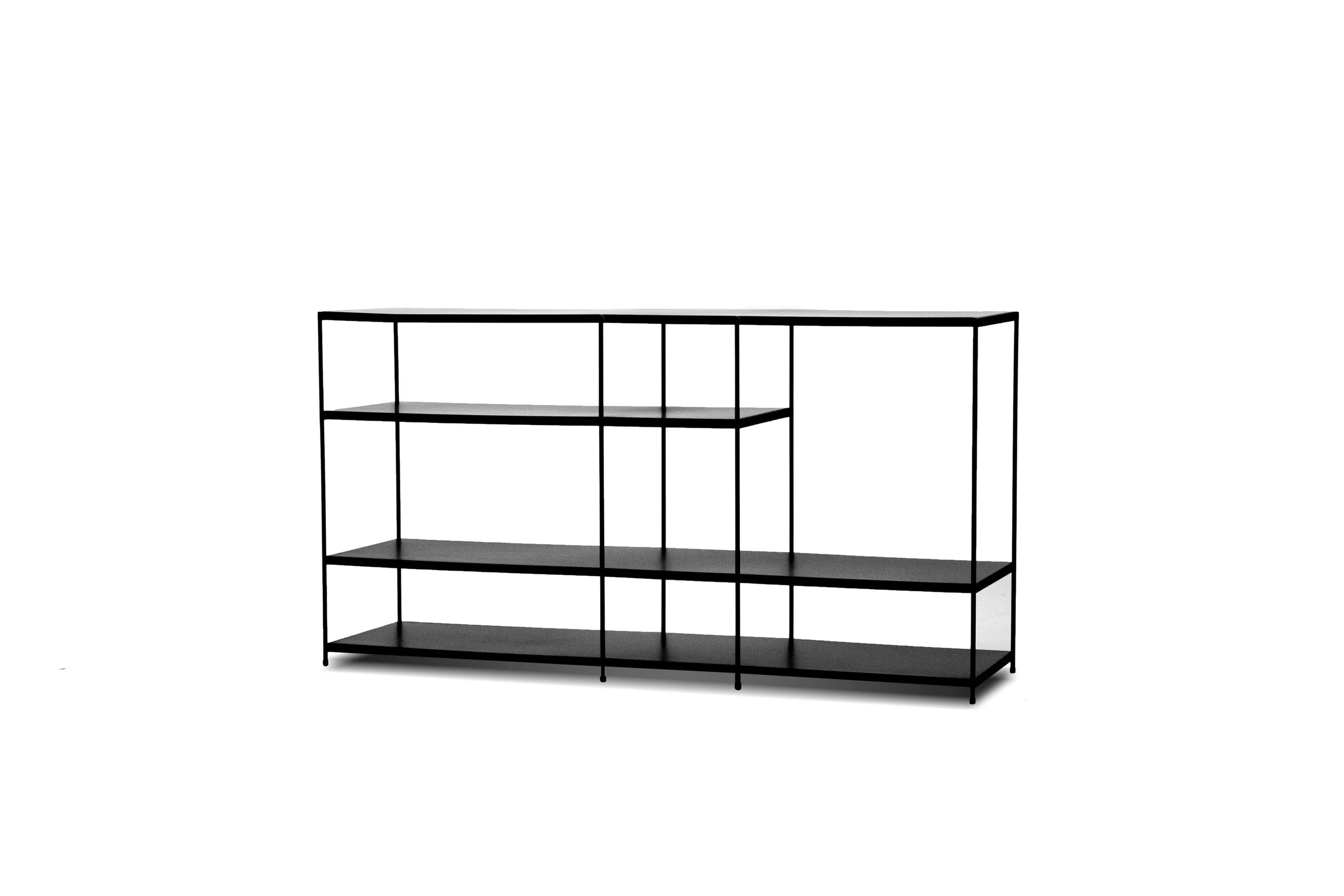 The Etta shelving series is hand made from elegant thin vertical steel tubing and flat sheet shelves. The unique openings allow for interesting displays of your favourite art objects, dinner ware, a fully stocked bar, books of all sizes, and even most practical, Houseplants! The Etta series comes in five different sizes.