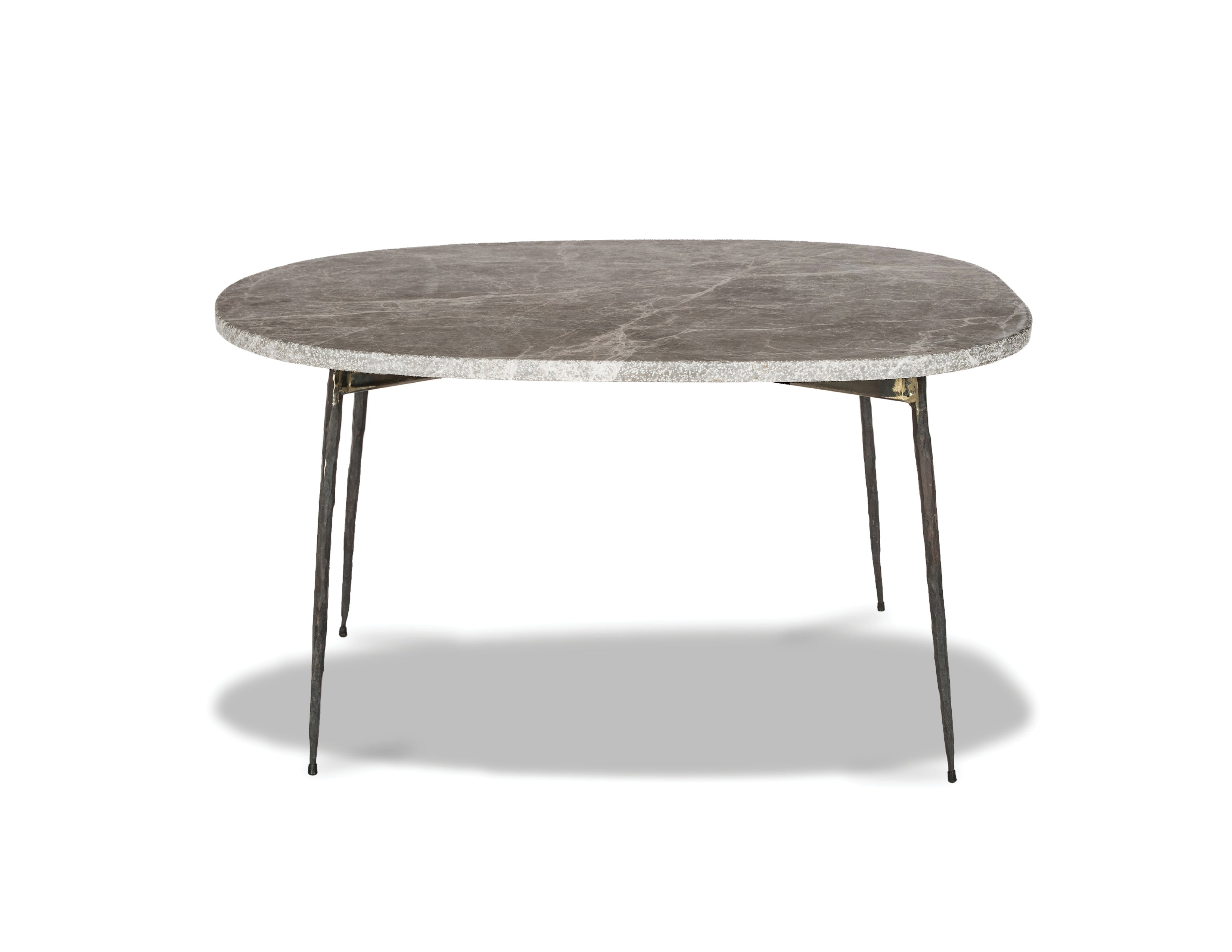 The TUK TUK tables are artisanal masterpieces. The base is forged hammered steel with elegant points down. The black Marquina Spanish marble has a honed finish and a natural shape, the edge detailing is sand-blasted giving the tables their hand made appearance.
