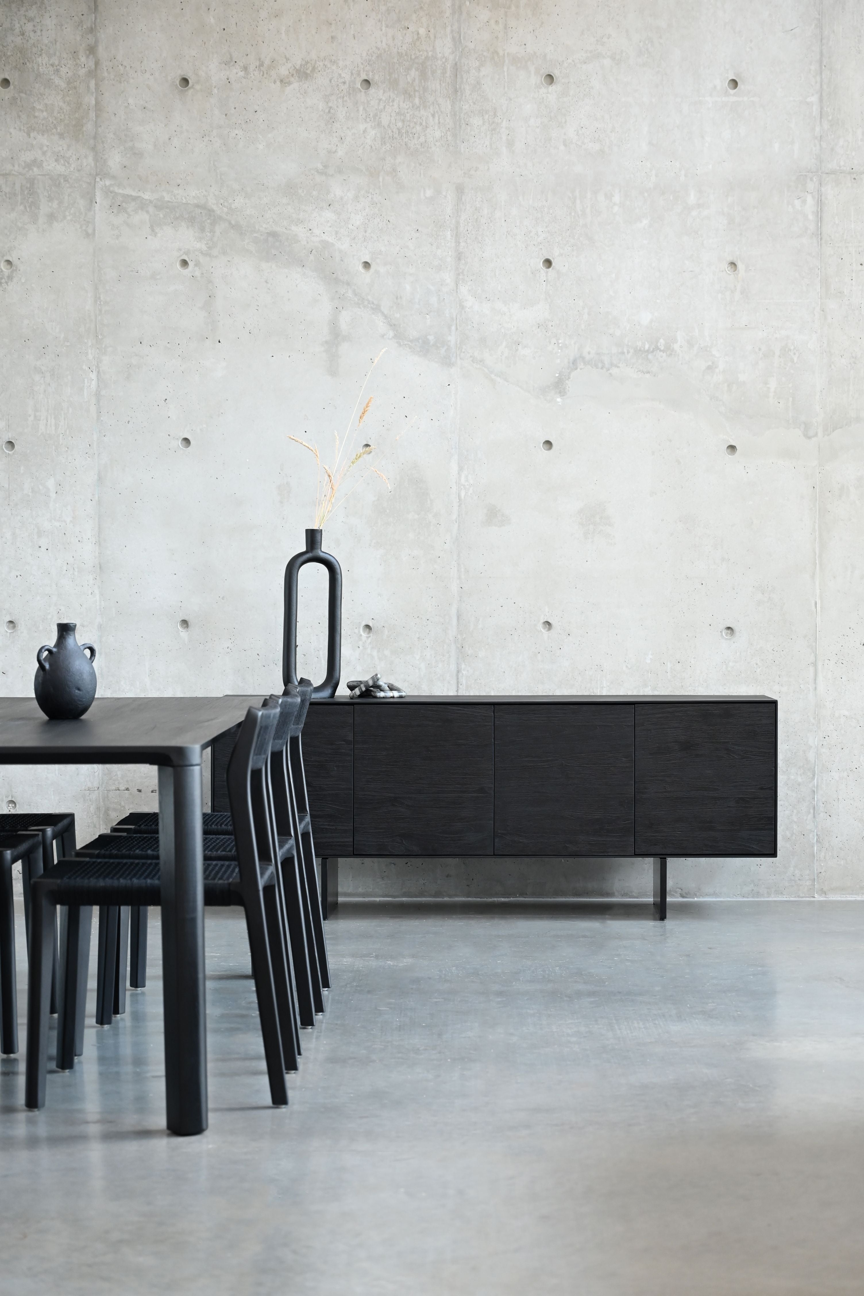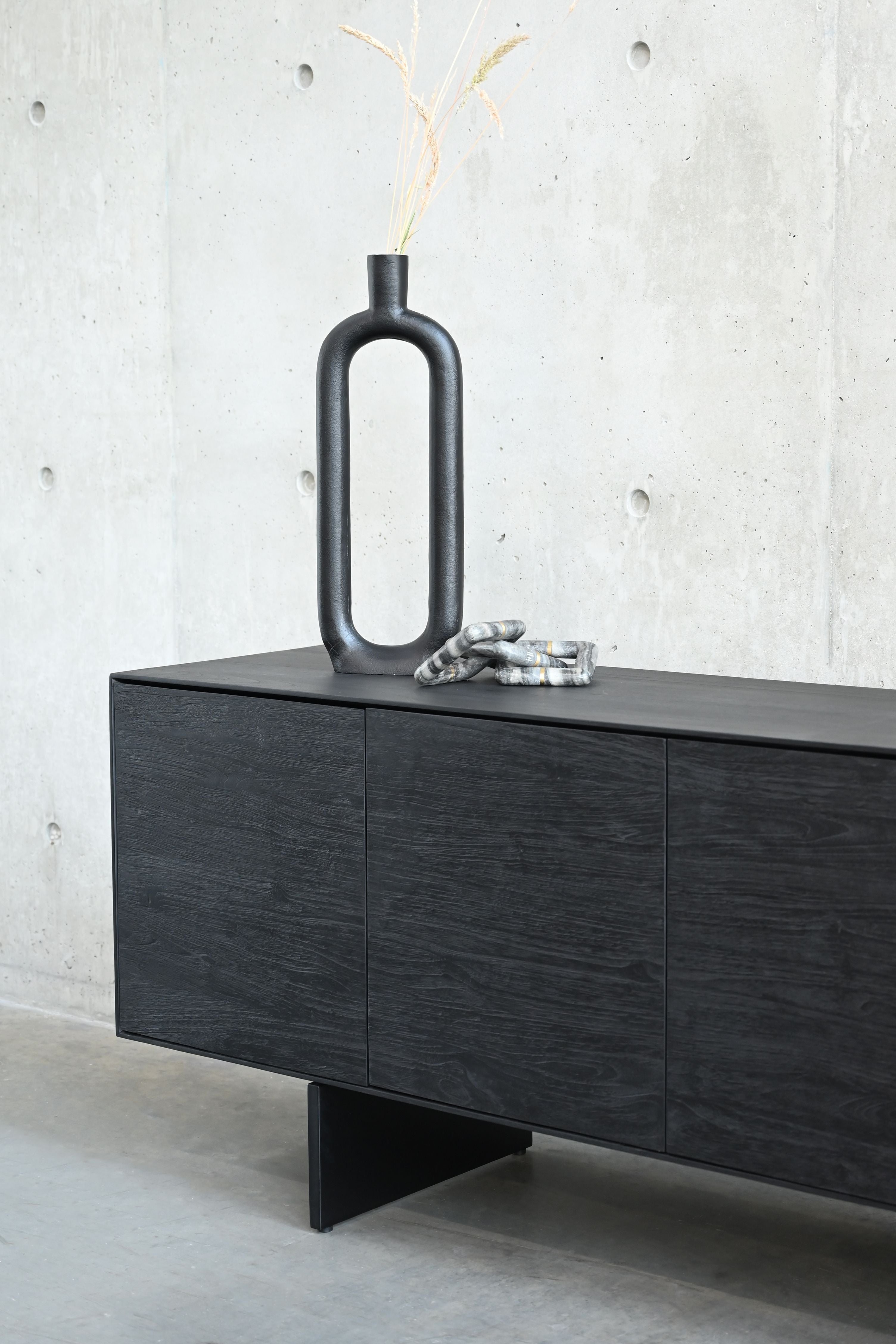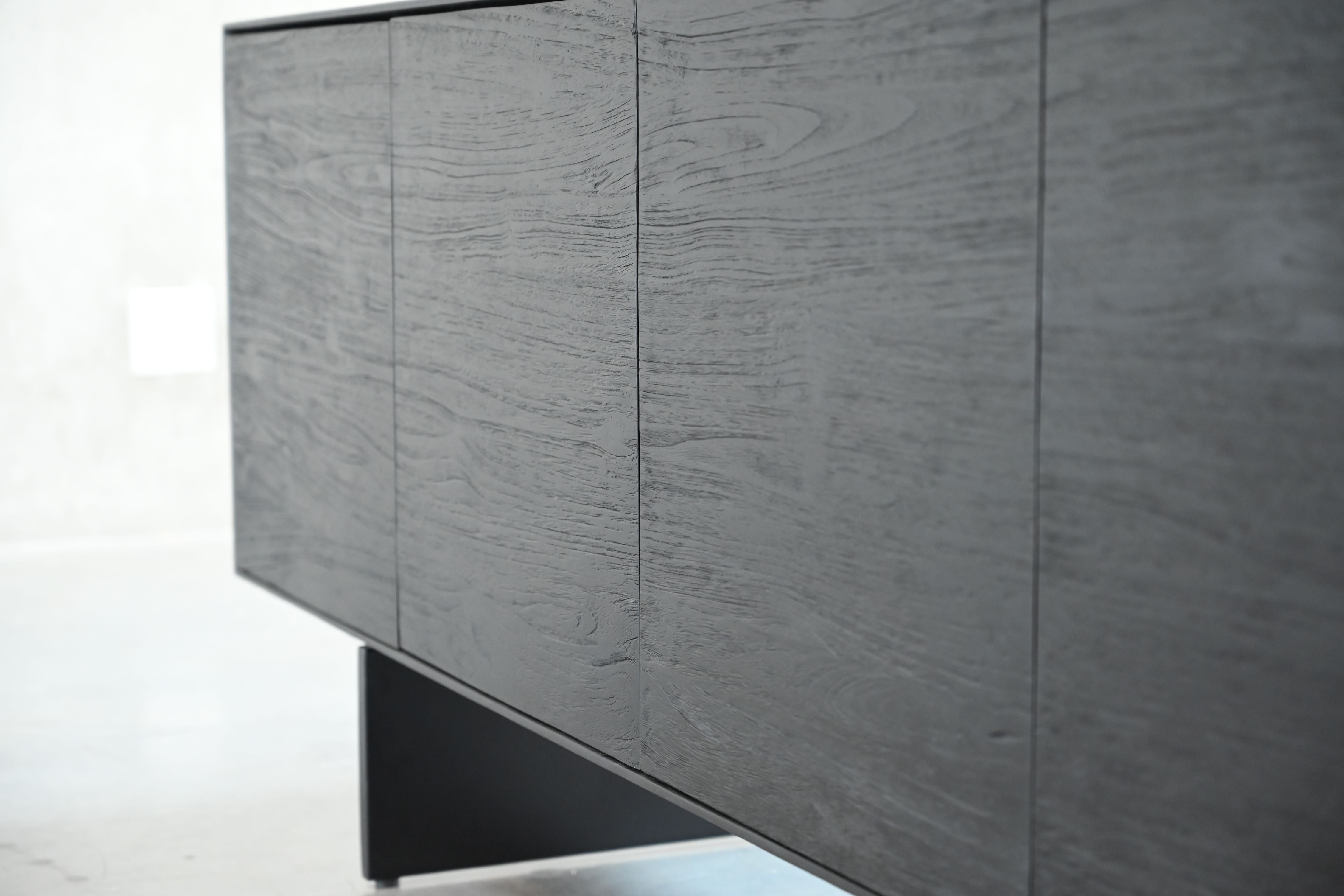 The BLOCK sideboard is crafted from high-quality teak wood, featuring a stylish black soot finish that adds a contemporary touch to any space. Its minimal black powder-coated steel base not only provides stability but also complements the elegant design, making it a sleek and functional storage solution for modern interiors.