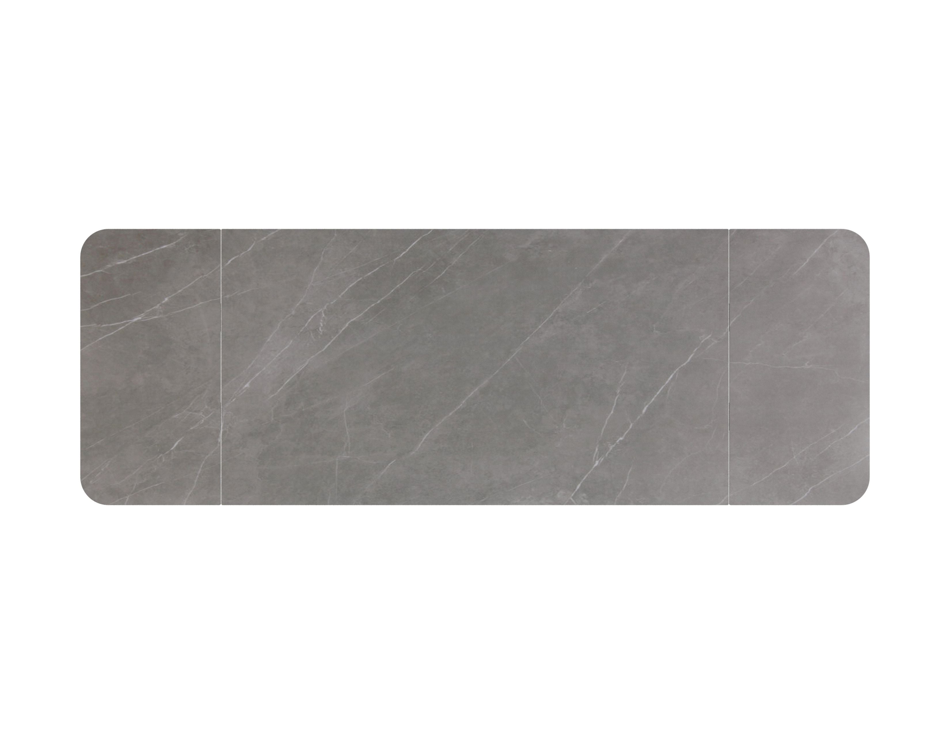The Palazzo Rectangular Ceramic Dining Table is a sleek and stylish piece of furniture that will add a modern touch to any dining room. This table features a grey ceramic top with curved edge design detail on each corner. The ceramic top is not only visually striking but also durable and easy to clean. The table's minimalist design is supported by steel matte black powder-coated legs. The extending leaves offer ample space for dining and entertaining guests, making it a perfect addition to any home. The Palazzo Rectangular Ceramic Dining Table is perfect for those who desire a contemporary and industrial look in their dining space.