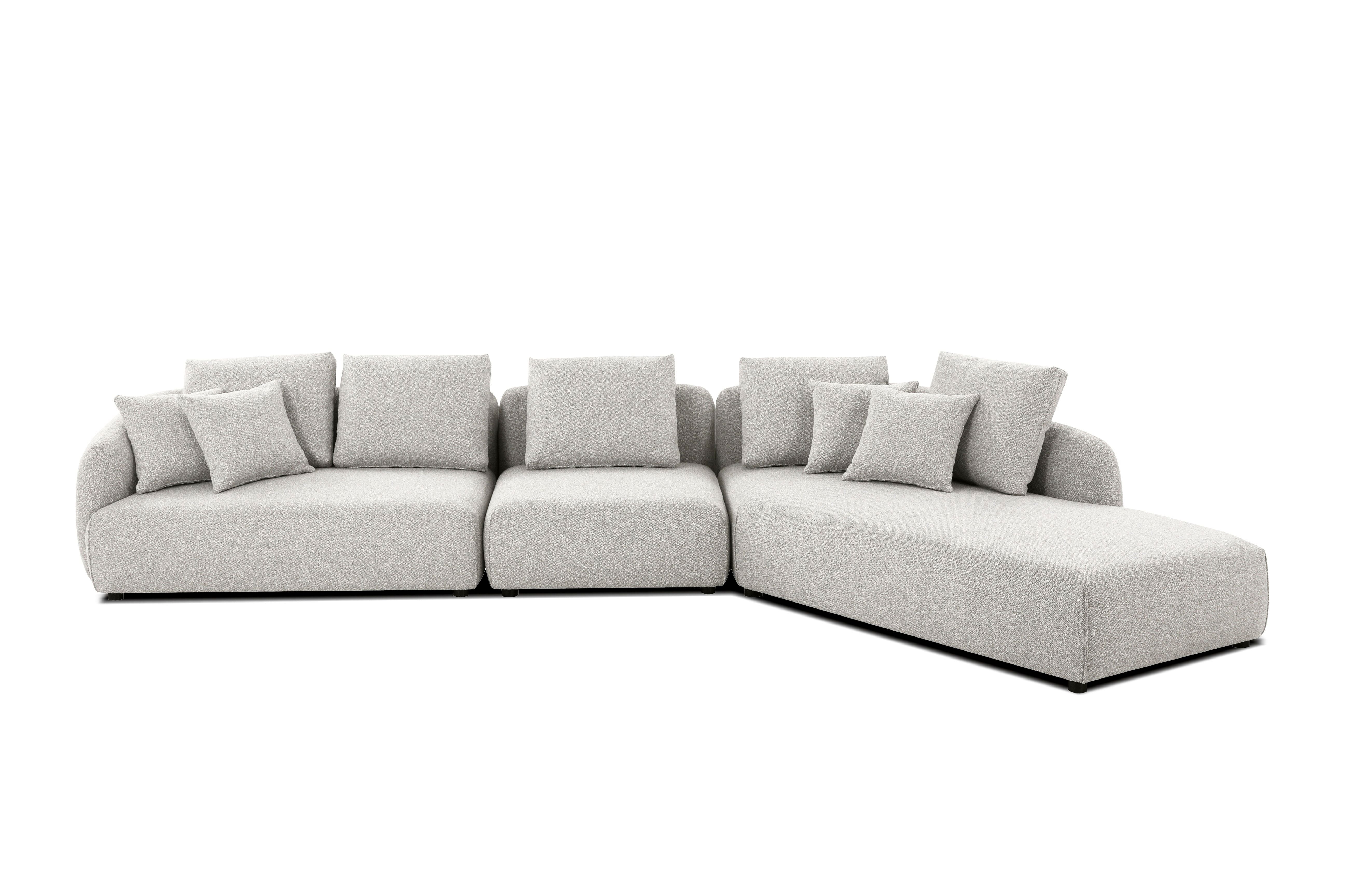 The Saba sectional is upholstered in a nubbly oat tweed fabric. This sectional features a modern low back design which allows you to float the sectional in your space and enjoy from all angles. Saba sectional features tall pillows and a deep seat for a cozy feel.