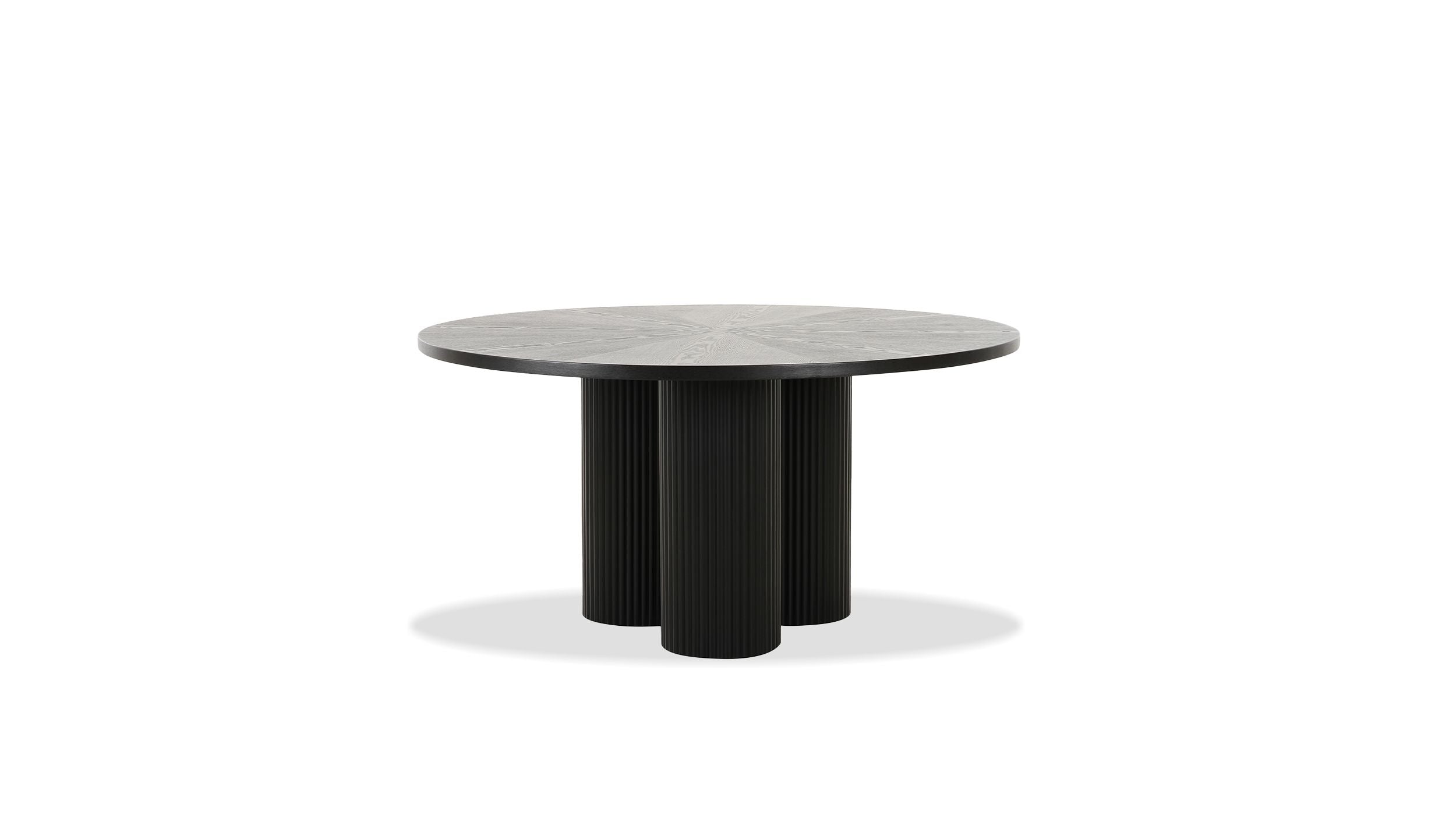 The IONIC dining table, made of black American Ash wood, is available in round sizes of 41", 48", 59", and 63". Its round design fosters connection and conversation during meals, making it ideal for hosting.
