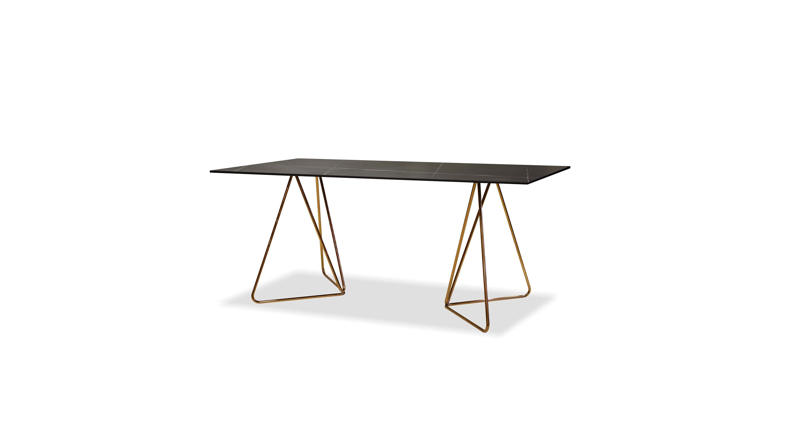The Papillon collection, with its butterfly legs has a variety of options, from a sintered stone, strog , antibacterial marble look, to clear glass top. It frame is in powder coated back finish or in rose gold .
