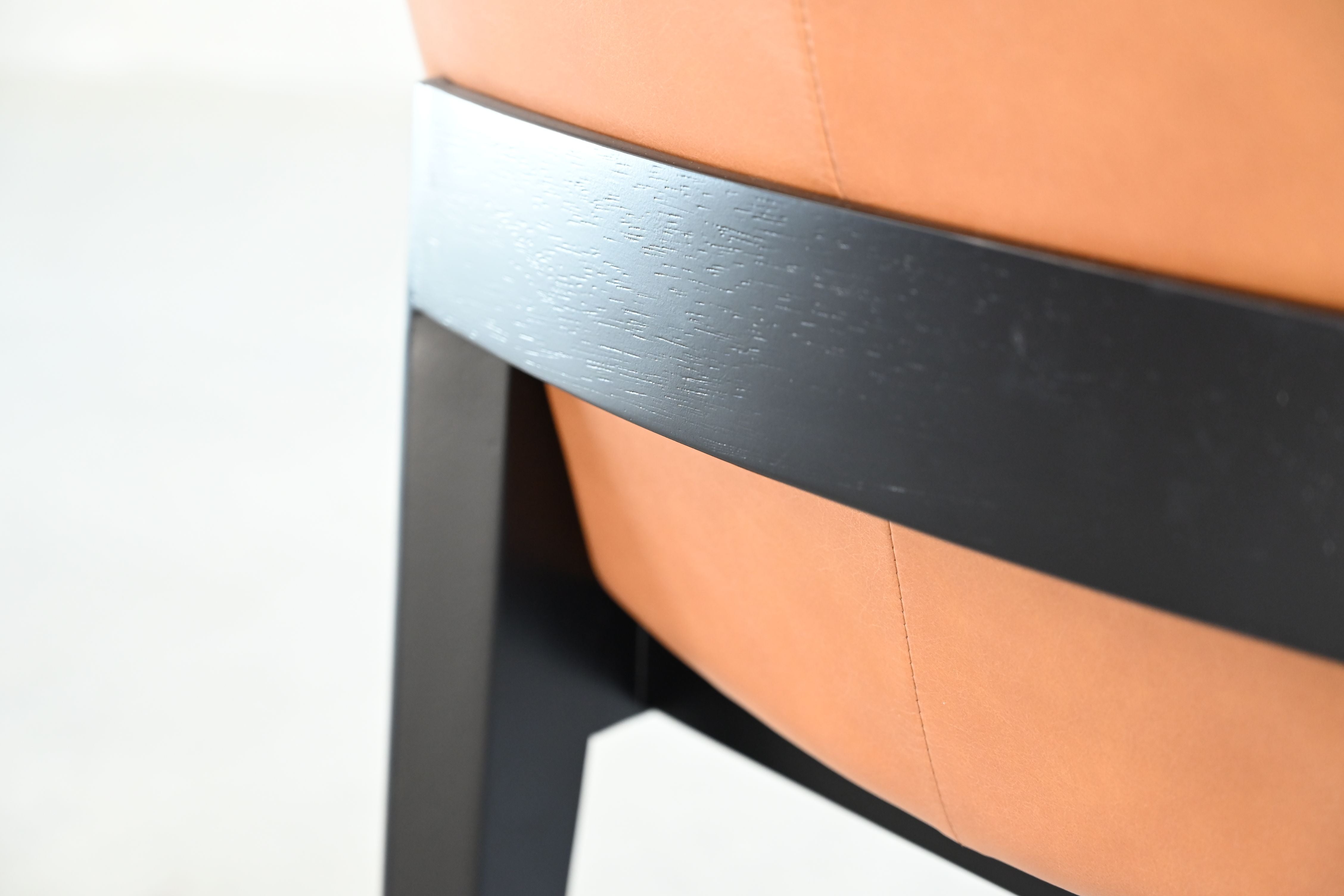 The HOLSTER Dining Chair is available in a stylish Palomino color option and is crafted from high-quality Sauvage Leather, ensuring both durability and aesthetic appeal. It features a sturdy black wood frame and back detail, making it an ideal choice for commercial projects. Matching counter stool now available.