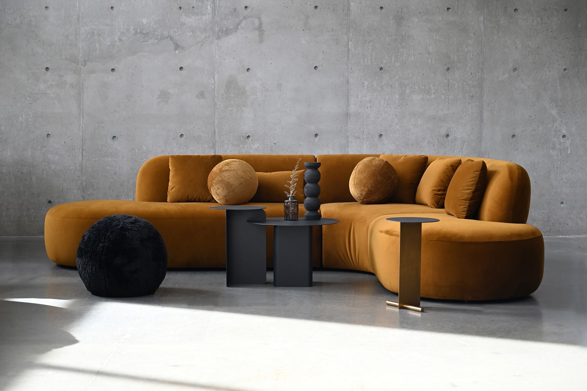 The Itza 3-piece sectional features a vibrant calendula velvet fabric that adds warmth and charm. Its playful design is highlighted by gracefully curved body and backrests, creating a inviting, relaxed vibe. The combination of square and round toss cushions enhances its casual, plush appearance. Offering a striking visual impact usually found in larger curved sectionals, Itza is designed in a more compact size ideal for smaller spaces. Choose from either a right-facing or left-facing chaise to suit your layout.